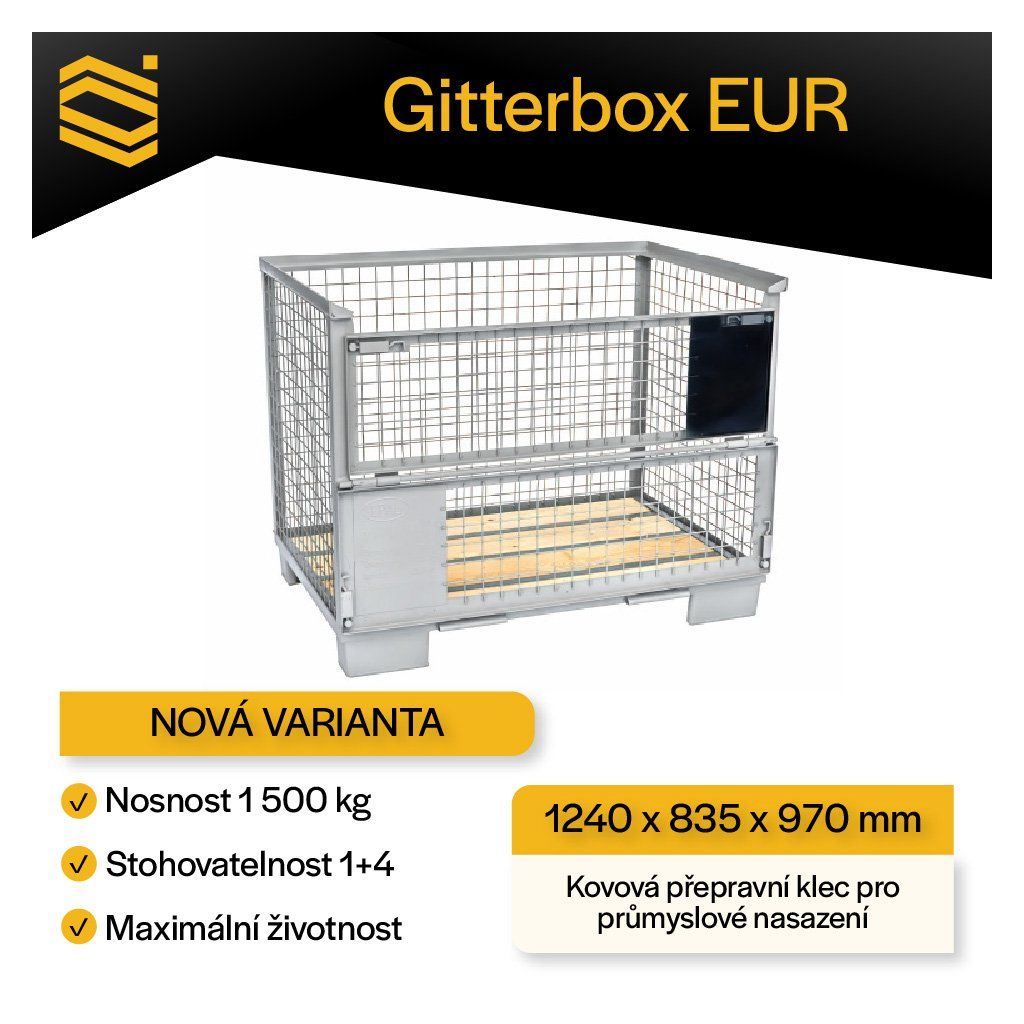 Nový EUR gitterbox je ocelová přepravní klec konstruovaná pro opakované nasazení v náročném průmyslovém provozu. Pevné mřížové stěny zajišťují bezpečnost kusového nákladu při přepravě i skladování, zároveň umožňují vizuální kontrolu obsahu.