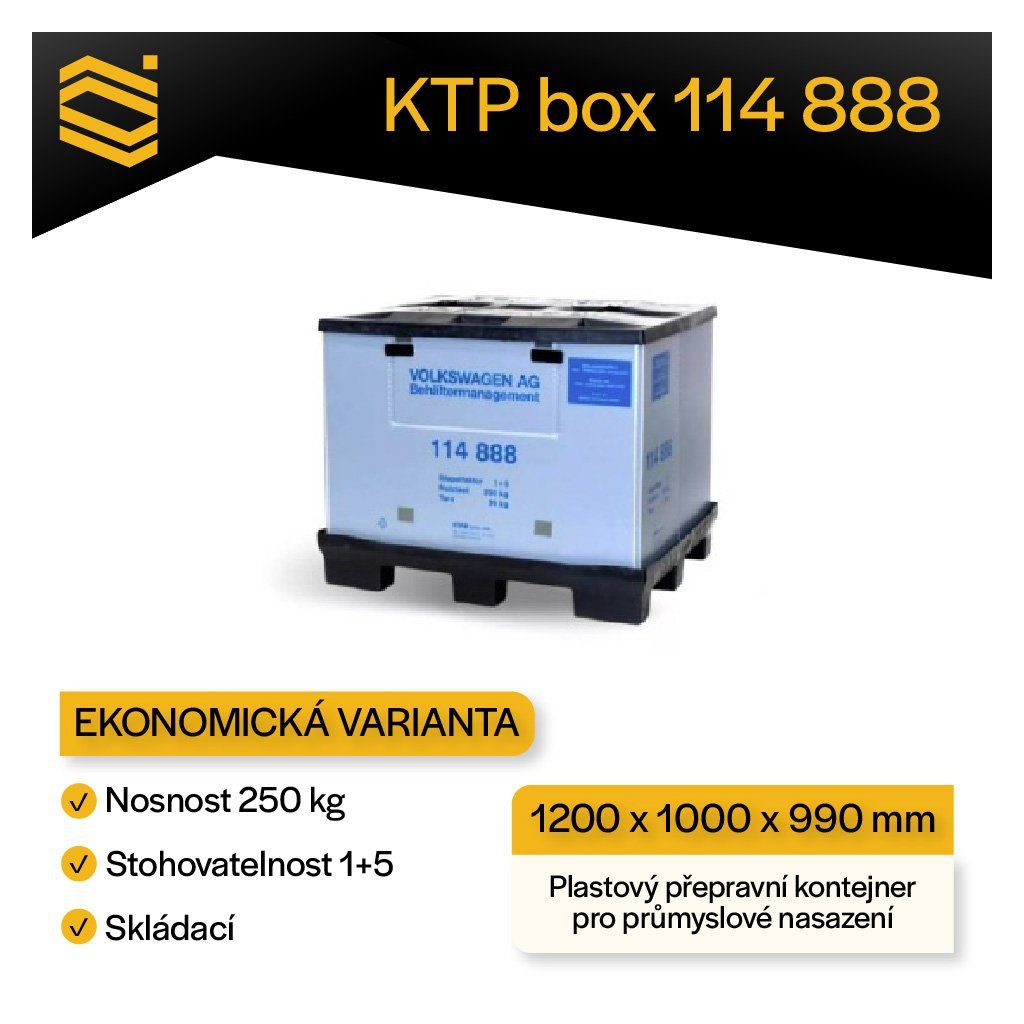 KTP 114 888 je skládací plastový přepravní kontejner střední velikosti, složený ze tří částí: palety, límce a víka. KTP box 114 888 je určen pro automobilový průmysl a průmyslovou logistiku. Plastová paleta je opatřena 9 nohami, odtokovými otvory a vnitřními výztuhami pro maximální pevnost. Víko s látkovými madly zamezuje pronikání vody a nečistot. Límec je vybaven dvířky se zámky pro lepší manipulaci se skladovaným materiálem.